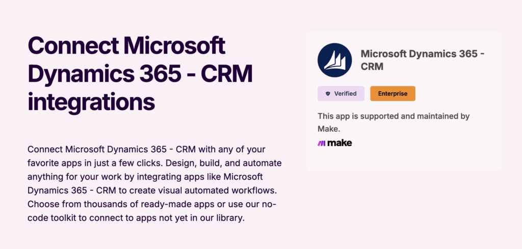 For additional information, here is a link to the Make.com website which speaks to how the Make.com platform integrates with Microsoft Dynamics 365 CRM .