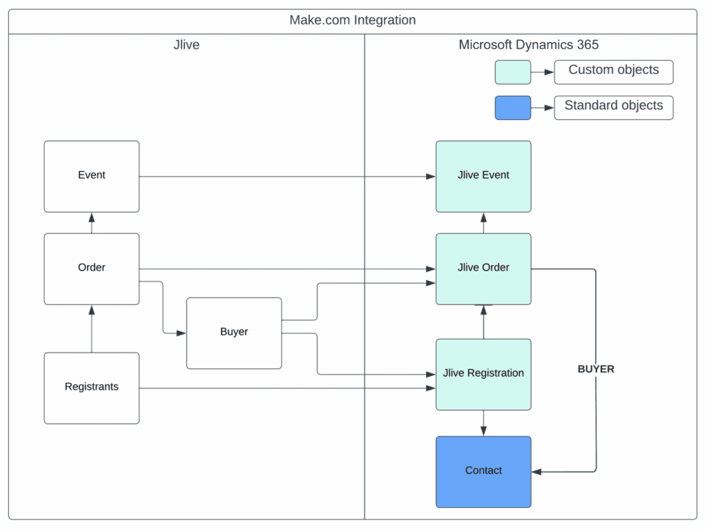This diagram shows how Jlive passes data into the pre-created Custom Objects for Jlive Event, Jlive Order, and Jlive Registration. Jlive Order and Jlive Registration pass data into the existing Microsoft Dynamics 365 CRM Contact Record.