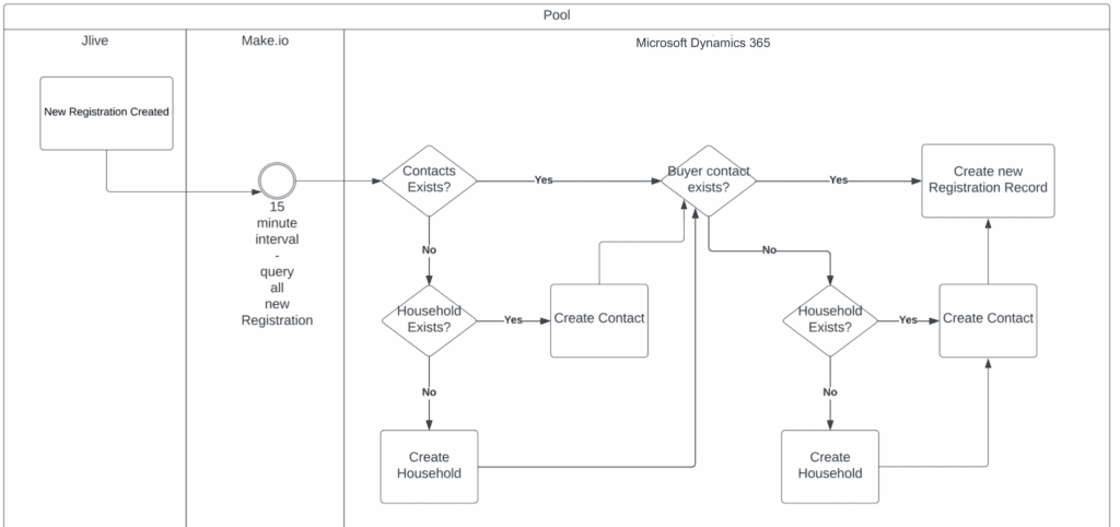 At a set interval (ex: every 15 minutes), Make.com will get New Registrations created within your Jlive organization and push that information into the Jlive Registration Custom Object. As you can see in the diagram below, there is some logic that will determine how your Microsoft Dynamics 365 CRM handles duplicate records and household. This may require a conversation with BKONECT in order to properly configure it to yoiur needs.