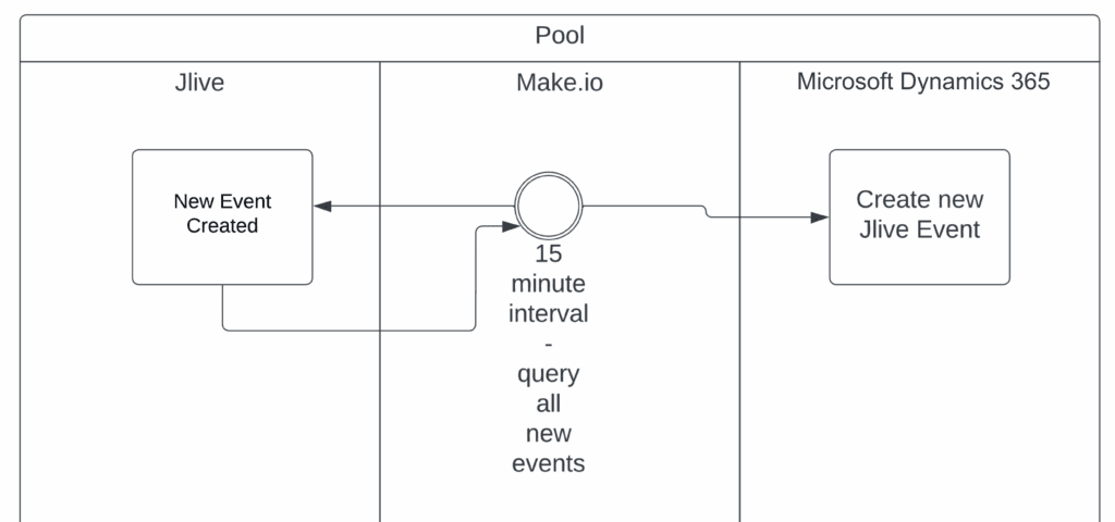 At a set interval (ex: every 15 minutes), Make.com will get New Events created within your Jlive organization and push that information into the Jlive Event Custom Object.
