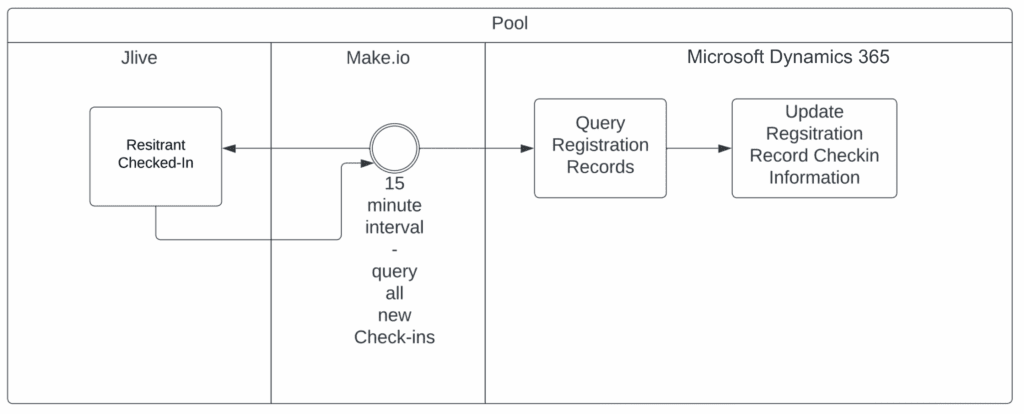 At a set interval (ex: every 15 minutes), Make.com will get New Registrant Check Ins created within your Jlive organization and push that Check In information into the Jlive Registration Custom Object in Check In Information field.
