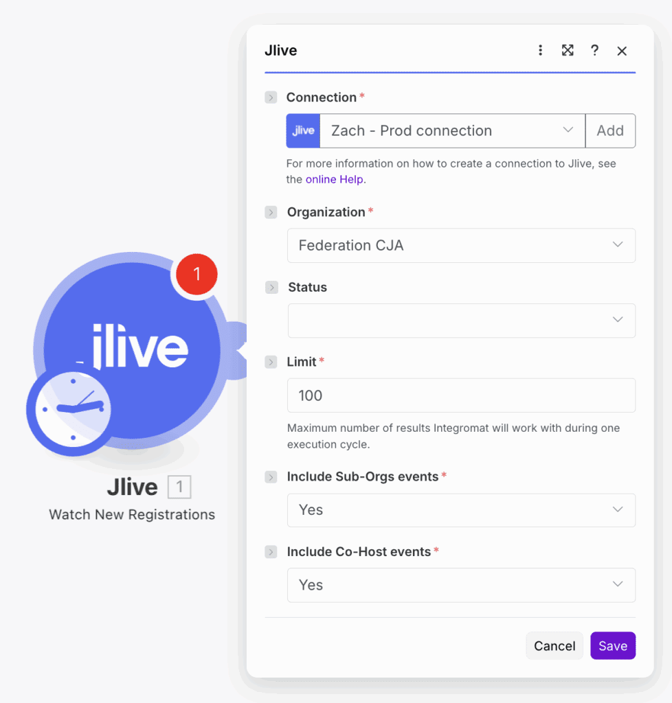 At a set interval (ex: every 15 minutes), Make.com will get New Events created within your Jlive organization and push that information into the Jlive Event Custom Object.